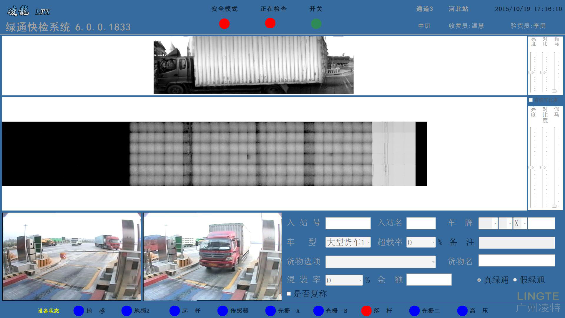 京石路此次安裝的X光綠通檢測設備,區(qū)別于常規(guī)的探頭檢測和放射線檢測裝置。它由一個Ⅲ類射線裝置、一個探測列陣裝置組成。該檢測設備利用Ⅲ類X光射線裝置發(fā)出的扇形射線透過車輛裝載的貨物,射線被另一側的探測器接收,利用不同貨物對X光射線吸收程度不同的原理,生成不同輪廓和形態(tài)的效果圖。工作人員可根據(jù)效果圖來判斷車輛是否屬于綠通車,從而達到快速準確檢驗的目的。