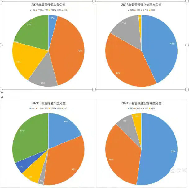 3.自集團(tuán)“綠色通道”車(chē)輛專(zhuān)項(xiàng)治理工作要求以來(lái),鄭庵收費(fèi)站精細(xì)化梳理排查假冒綠通類(lèi)別,針對(duì)性強(qiáng)化查驗(yàn)。假冒綠通車(chē)型和貨物種類(lèi)分類(lèi)如圖: